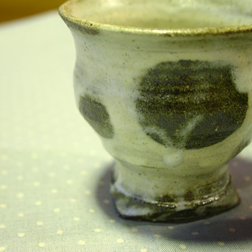 かわいい水玉のデザイン、少し変わった形の湯呑みです。